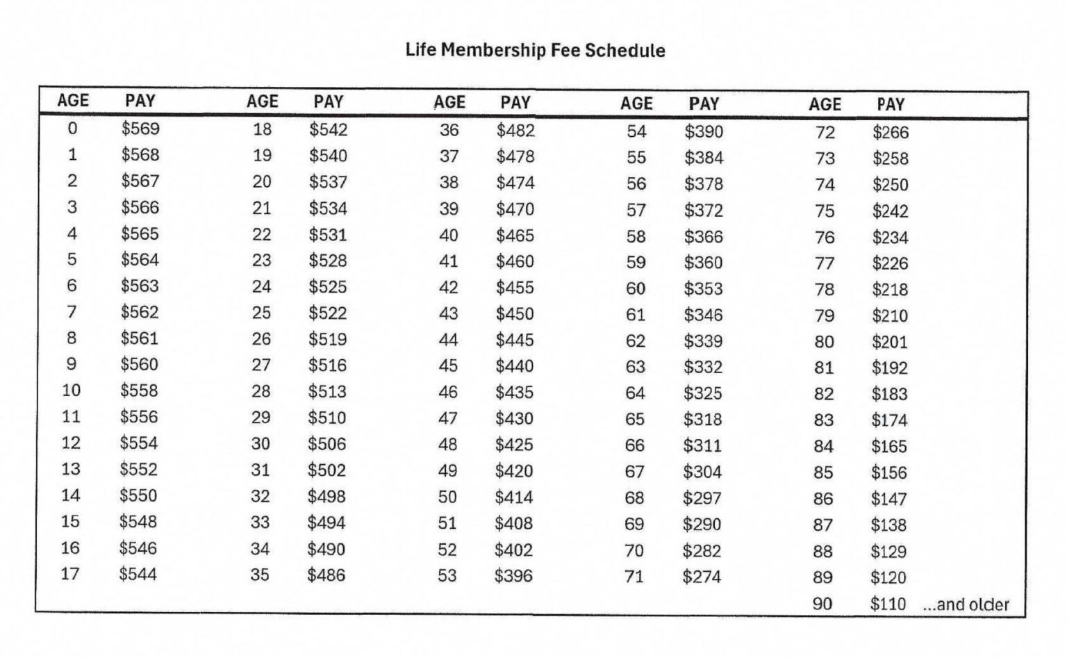 Life memberships are available to all members. Life members pay no annual dues. Even in the event of an annual dues increase for regular members, your life membership status will always remain intact. Below is a copy of the life membership fee schedule. To apply for life membership, please complete and submit the Life Membership Form at this link.