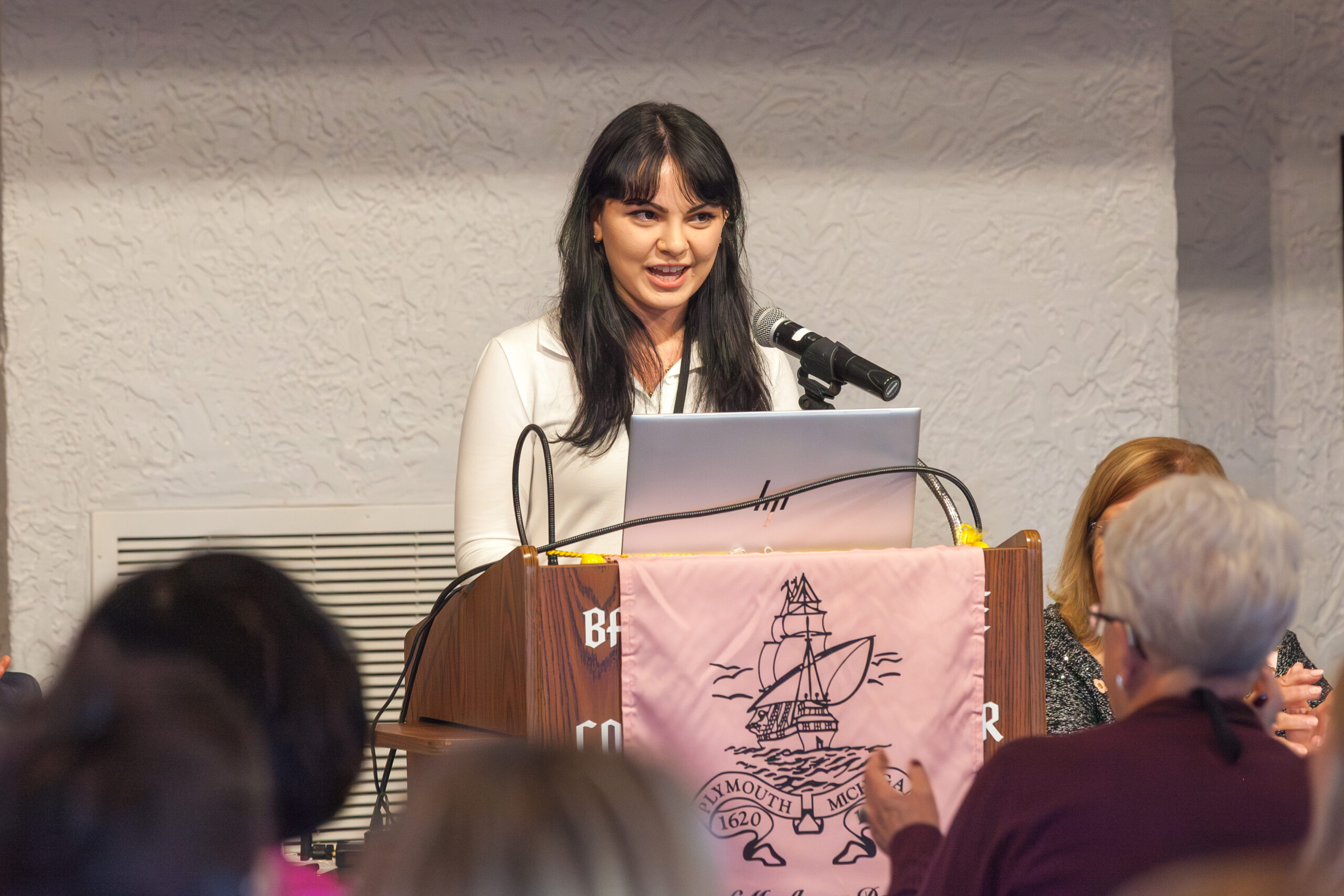 The Society of Mayflower Descendants in Michigan held its annual Spring Luncheon on Saturday, May 17, 2025. The meeting was well attended with 113 members and guests. Guest speaker was Malka Benjamin, Director of Colonial Interpretation & Training at Plimoth Patuxet Museums in Plymouth, Massachusetts. Malka, whose flight to Michigan was unexpectedly cancelled, presented via Zoom in a wonderful presentation. She was dressed as Alice (Carpenter)(Southworth) Bradford, second wife of Governor William Bradford. After the presentation, Malka answered members' questions both as Alice Bradford, and herself.